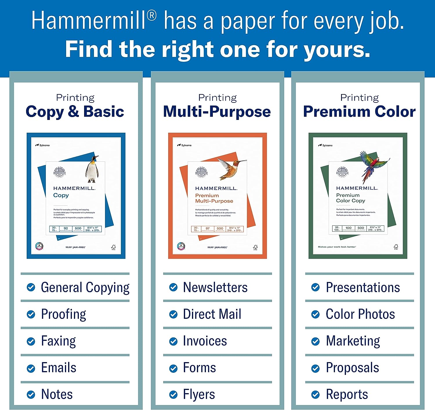 - OTHER PAPER OPTIONS: Scroll down to compare Hammermill print and copy paper for every purpose, including premium presentation-quality color copy paper, cover-weight paper stock, and glossy paper for photo printing